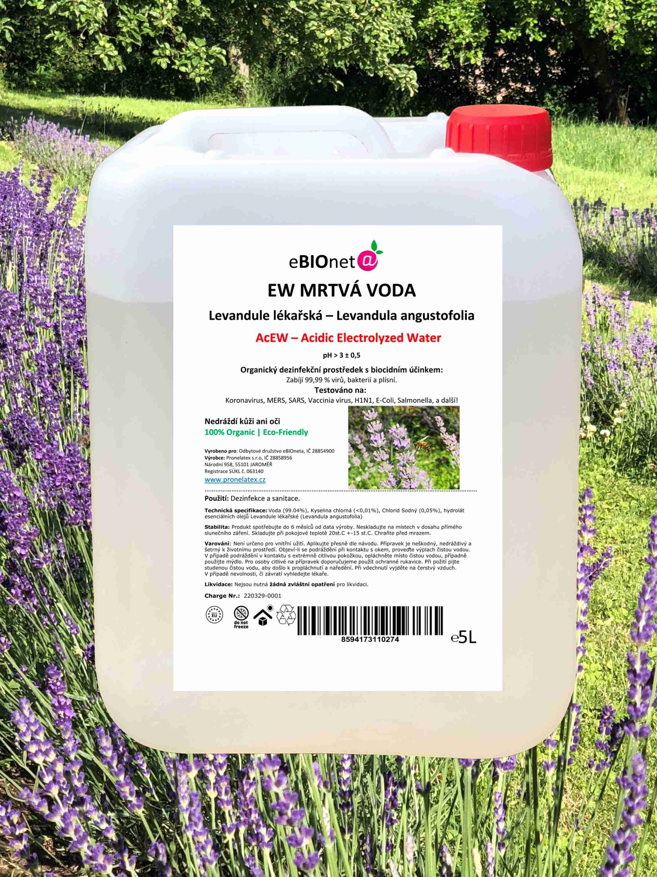 Technická specifikace: Elektrolyticky upravená Voda (99.04%), Kyselina chlorná (<0,01%), Chlorid Sodný (0,05%), %), hydrolát esenciálních olejů Levandule lékařské (Levandula angustofolia)